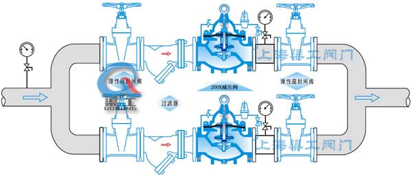 本公司的200X減壓穩壓閥由主閥、導閥、針閥、球閥、微型過濾器和壓力表組成水力控制接管系統。使用時,當調定出口壓力后,能自動保持穩定出口壓力。